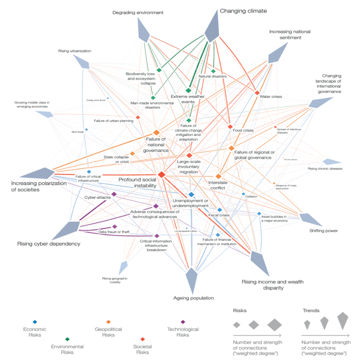It is interesting that the World Economic Forum’s risk-trends assessment also lists Climate Change as their top issue, with an eerily similar list of corollary risk factors.