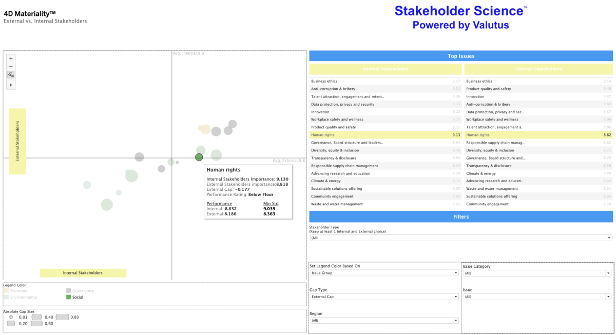 In the same way, is it good enough to look in the rearview mirror every two years? Clearly not, yet that is the plodding cadence of traditional materiality. In contrast, our Stakeholder Science™ offering quadruples the clock speed by updating key information every six months (or more often, if desired), while adding over-the-horizon data from our E3Evolution™ and Valutus Issues Early Warning System (VIEWS™) offerings and integrating with our Customer Science™ research capabilities.