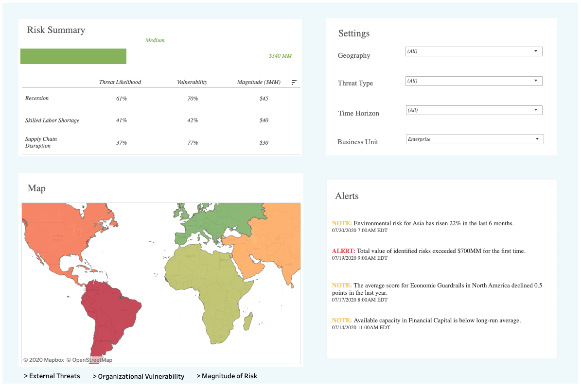 Once connected to your internal systems, the tool can do in a few hours what used to take days, and gives us a thorough, comprehensive, and concise view of risk. And, as you can see, it makes risks visible, sortable (by geography, threat type, time horizon, and business unit) and, most importantly, more actionable. (If you’d like to know more, drop us a line).