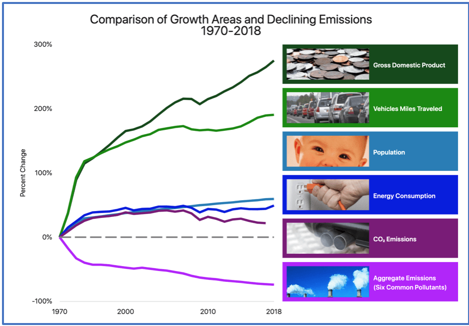 So what should we do? Well, it occurs to me that a snapshot of success in this area looks a lot like the Clean Air Act and the establishment of the EPA, in 1970. We’re just shy of 50 years on from those acts and consider that over this period, GDP has risen nearly 300% while emissions have dropped about 80%. Now that is an accomplishment.
