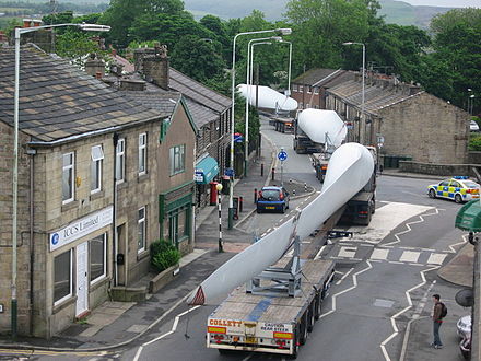 Turbine blades in Edenfield, England en route to the Scout Moor Windfarm.